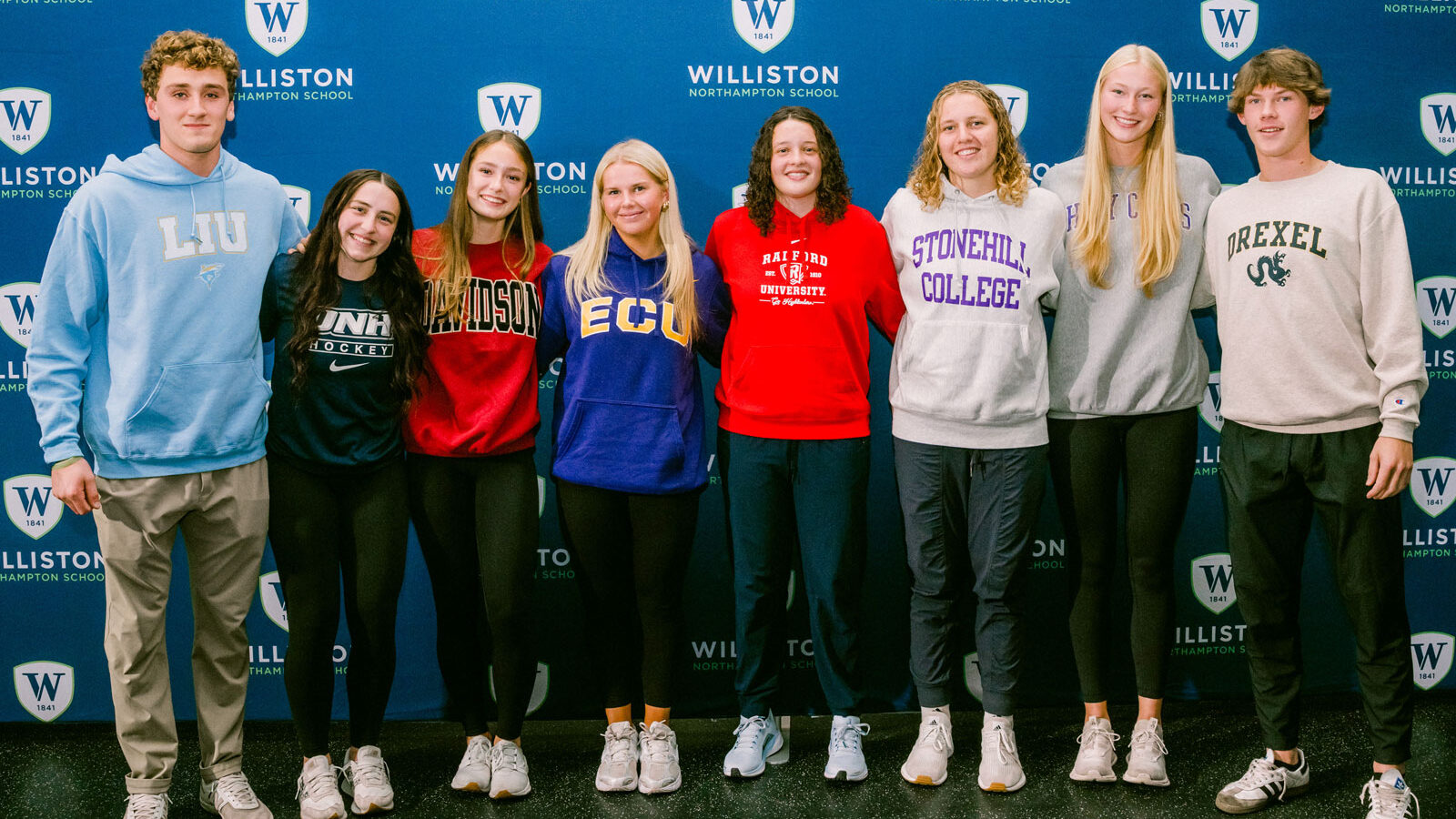 On Monday, November 10, 2025, the Williston Northampton School community gathered in the Sabina Cain Family Athletic Center to celebrate eight student-athletes that made their college athletic commitments. With friends and family in attendance, each student-athlete was called up to be recognized, then take pictures. Below are the remarks by Director of Athletics Jade Morris. You can watch the ceremony on our YouTube page, and see pictures on our Flickr page.